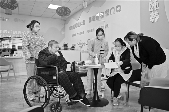 11月19日,在浙江省慈溪市白沙路街道居家养老服务中心,81岁老人吴森泉(左二)在接受免费助浴服务前进行身体状况检查。近年来,慈溪市民政部门持续开展“一老一小”朝夕共守惠民工程行动,推动社会保障服务提质升级。新华社记者 黄宗治 摄