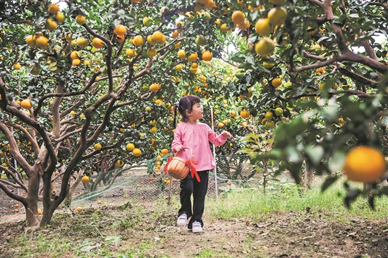 图为近日一个小女孩在姚庄镇的果园里采摘橘子。本报记者 王伟伟 摄