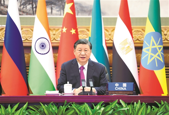 习近平强调,金砖合作机制是新兴市场国家和发展中国家加强团结合作、维护共同利益的重要平台。今天,我们就巴以问题协调立场、采取行动,为扩员后的“大金砖合作”开了个好头。中方愿同其他成员一道,开创金砖合作新时代。