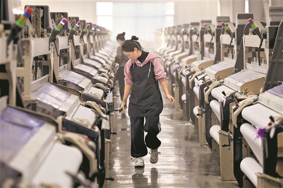临近年末,蚌埠市五河县各纺织企业的工人加紧生产,赶制订单。近年来,五河县将纺织服装产业作为主导产业,引进上下游相关企业90余家,形成了集棉纺、家纺、服装生产等于一体的纺织服装特色产业集群。新华社记者 黄博涵 摄