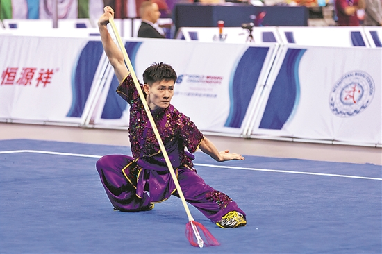 图为中国选手张清淳在男子枪术比赛中夺冠。新华社发(田丹 摄)
