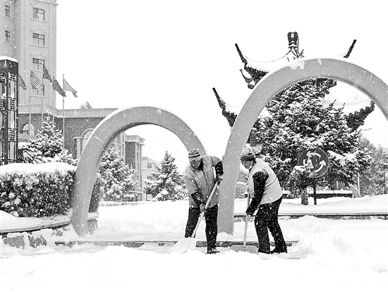 11月22日,霍林郭勒市环卫工人清扫路面积雪。