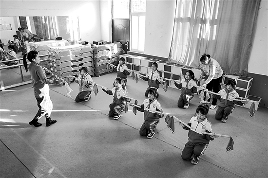 11月22日,地秧歌艺人在河北省滦州市小闫营小学指导学生练习地秧歌。