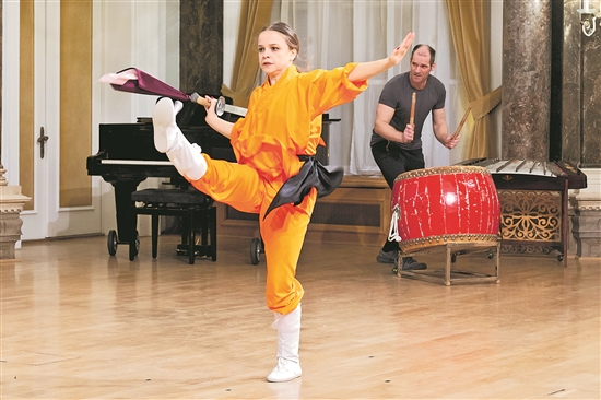 匈牙利罗兰大学中文系成立100周年庆典近日在匈首都布达佩斯举行,中匈各界百余名代表参加。这是在庆典上拍摄的中国功夫表演。新华社发 (弗尔季·奥蒂洛 摄)