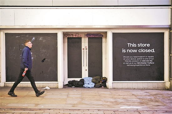 当地时间11月22日,在英国曼彻斯特,一名无家可归者躺在一家关闭的店铺前。英国财政大臣杰里米·亨特22日在议会公布秋季预算案时表示,政府将削减税收以拉动经济增长。 新华社发 (乔恩·休珀 摄)