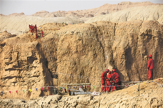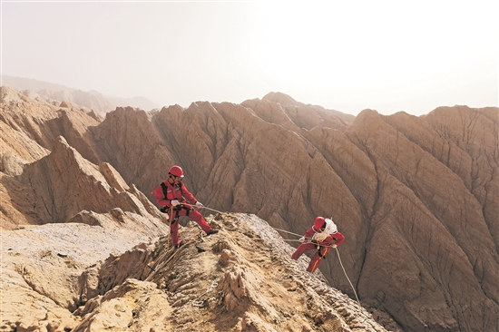 11月7日,新疆阿克苏北喀山,西南物探山地物探项目部的两名测量操作手准备从山顶系绳降下进行测量。