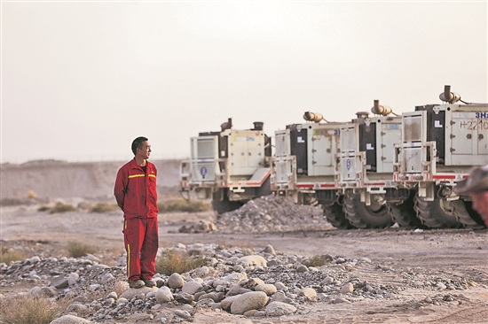 11月8日,震源车工地。在荒漠戈壁上使用震源车大大提高了工作效率。