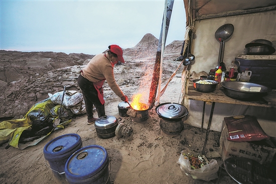 帐篷外,早起忙活了1个多小时的谭淑芳大姐终于可以松口气了。早晨7点起床为8位工人做早饭,送走他们,简单休整后,她又将准备开始做午饭,要赶在11点前出发,背着8个人十多斤重的午餐翻山越岭1个多小时,送到工人的钻井点位,送饭来回需要3个多小时。而早上摸黑出去的工人们结束一天工作返回时又将披星戴月。