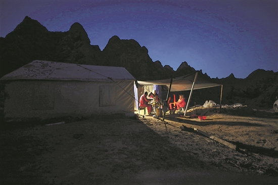 11月11日早晨8点30分,在位于祖国西北边陲的新疆阿克苏北喀山腹地,这里还属于黎明前的黑暗。多日的扬沙天气被一夜大风刮出了满天繁星,一轮弯月和它上方的启明星在夜空中熠熠生辉。孤寂的群山之巅,两顶白色的帐篷被灯光照得通亮,时不时晃动的人影投射到帐篷上,为这清冷的大山增添了一丝活力。