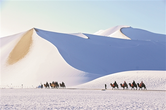 雪后的甘肃敦煌鸣沙山月牙泉景区银装素裹,景色如画,美不胜收。