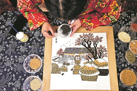 馆陶粮画起源于唐朝,以五谷杂粮和各类植物种子为原料,通过粘、贴、拼、雕等十几道特殊工艺,制作成山水、人物、花鸟等图画,成为独具乡村风情的艺术品。图为日前河北省邯郸市馆陶县寿东村“粮画小镇”,粮画艺人在制作粮画作品。