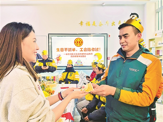 11月29日,新疆维吾尔自治区乌鲁木齐市水磨沟区总工会在户外劳动者服务绿城站点为100名在11月过生日的快递员、外卖骑手过集体生日,为他们送上生日祝福和大礼包。本报记者 吴铎思 本报通讯员 孙振嵩 摄