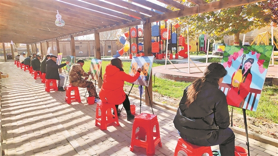 在新疆喀什麦盖提县库木萨尔乡,当地的农民画家趁着农闲时节,正在长廊上进行创作。
