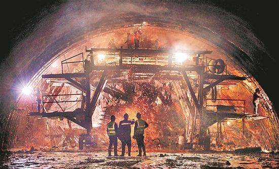 11月27日,中铁二局建设者在胶州湾第二海底隧道内施工作业。