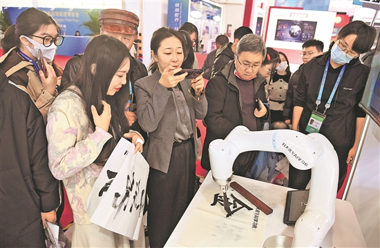 图为12月2日,参观者在数字科技链展区科大讯飞展位观看一款AI书法机器人写毛笔字。新华社记者 蔡湘鑫 摄