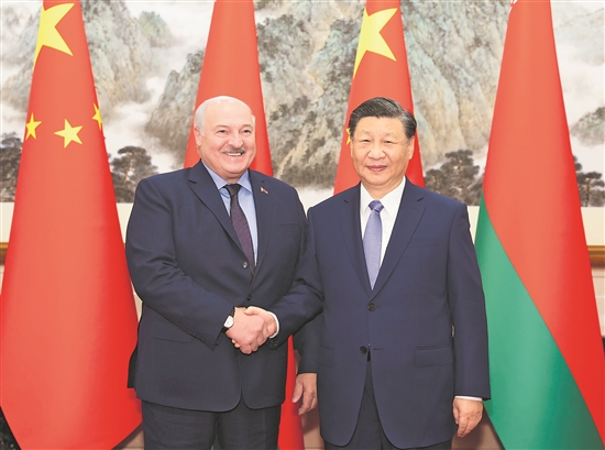 习近平强调,十年前我提出共建“一带一路”倡议,现在已有150多个国家参与合作。不久前,我提出中国支持高质量共建“一带一路”的八项行动,欢迎白方继续积极参与,从中获得更多实实在在的发展机遇。双方要实施好中白工业园等项目,推动中白工业合作取得更多成果。双方要提高跨境运输便利化水平,促进经贸和人员往来。定期互办文化日活动,扩大教育、卫生、体育、旅游合作,支持两国青年开展交流合作,增进两国人民相互了解和友谊。中白双方是参与全球治理体系改革和建设的重要力量。中方愿同白方加强在联合国、上海合作组织等多边机制内协调和配合,推动落实全球发展倡议、全球安全倡议、全球文明倡议,推动构建人类命运共同体。