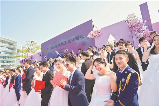 这是珠海市总工会举办的第四届职工集体婚礼,参加本次集体婚礼的100对新人,既有医务人员、公安干警、消防指战员、基层干部、志愿者,也有一线产业工人、新就业形态劳动者以及珠澳各行各业的青年职工。