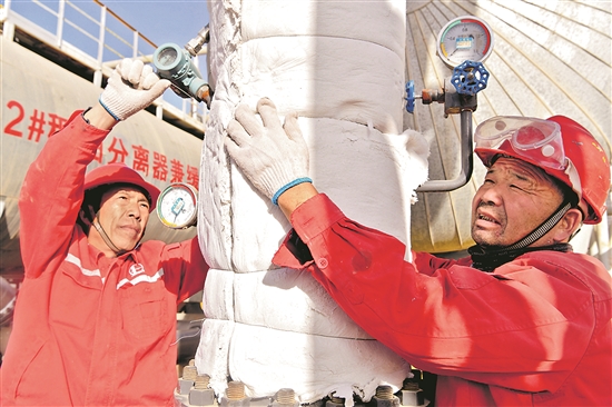 入冬以来,西北油田采油三厂组织各单位在前期冬防保温工作完成的基础上“查缺补漏”,全面做好盲区及死角处保温不完好的消除工作,确保冬季生产中管线不冻、设备不坏、生产不乱。图为11月25日,施工人员在8-3计转站完善缓冲罐进口管线的保温设施。冯玉军 摄