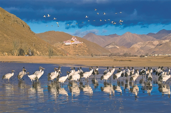 西藏拉萨市林周县位于拉萨河上游及澎波河流域,平均海拔约4200米,是黑颈鹤的主要越冬地之一。新华社记者 姜帆 摄