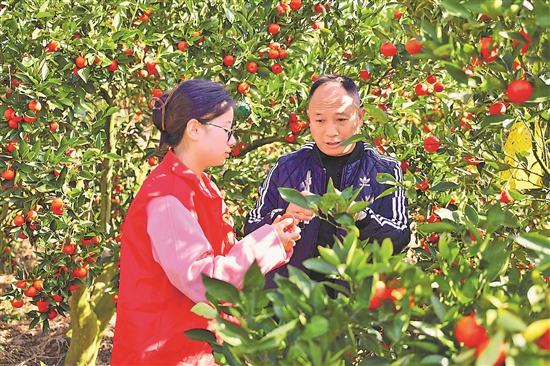 贵州惠水县今年以来深入实施乡村“四进工程”,积极推动各类专业技术人才下沉农村投资兴业、创新创业,帮助村集体经济组织解决生产难题。图为近日柑橘种植专家刘勇(右一)为乡镇干部讲授“牛肉红”柑橘管护知识。龙斌 王祖 摄