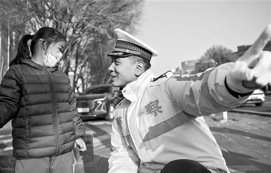 12月2日,在乌鲁木齐南湖路附近,乌鲁木齐市公安局交警支队民警向一名小朋友宣讲交通安全知识。
