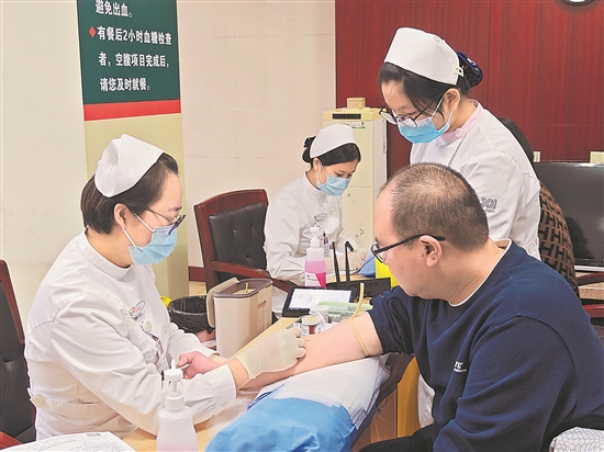 12月6日,在北京市房山区拱辰街道总工会的组织下,300余名以新就业形态劳动者为主的职工到北京市武警医院体检中心参加免费健康体检。图为体检现场。