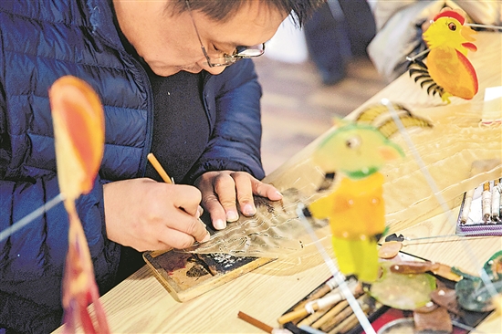 图为郭宝正在驴皮上雕刻皮影。