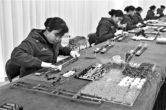 12月7日,工人在张飞返乡创办的公司生产线上组装电吹管。