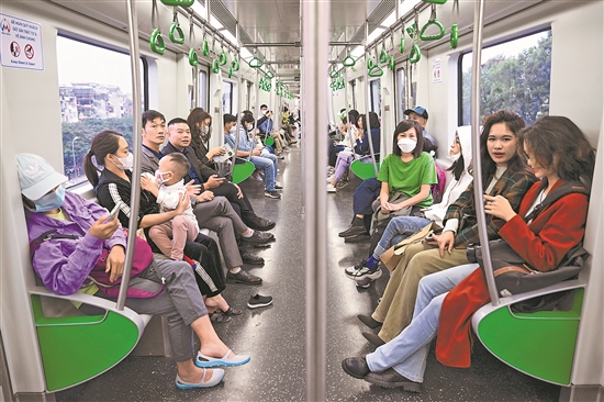 当地时间12月9日,人们在越南河内乘坐吉灵-河东线轻轨。