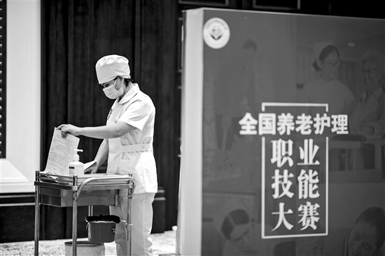 2021年,参加全国养老护理职业技能大赛选拔赛的选手在进行实操比赛。袁琛/视觉中国