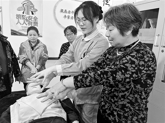 在居家养老服务中心,陈燕团队工作人员在给居民进行心肺复苏培训。受访者供图