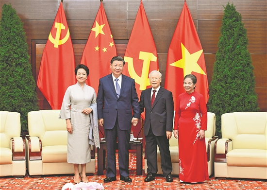 习近平说,中共二十大胜利召开后,我第一时间邀请阮富仲总书记访华,此次我又以对越南国事访问作为今年中国外交圆满收官,具有重要意义。中越两党领导人亲自擘画两党两国关系发展,是我们的良好传统。此访期间,我们共同宣布构建具有战略意义的命运共同体,使中越关系站在新的历史起点上,必将推动中越关系迈上新台阶。