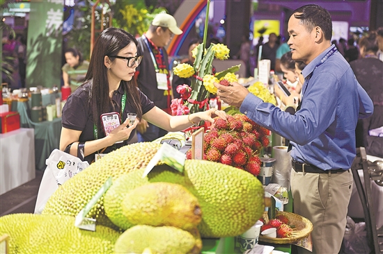 12月14日,观众在海南冬交会上选购海南琼中展台展示的各类热带水果。