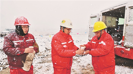 针对突如其来的寒潮大雪天气,河南油田科学调整运行方式,严格落实干部带班制度,做好防寒、防冻、防滑措施,保障高产井、重点施工、新投井等施工生产。图为12月15日,双H7-128井换光杆施工现场,油服中心采油维修1队队长李强为大家送来姜汤御寒。鲁海涛 摄