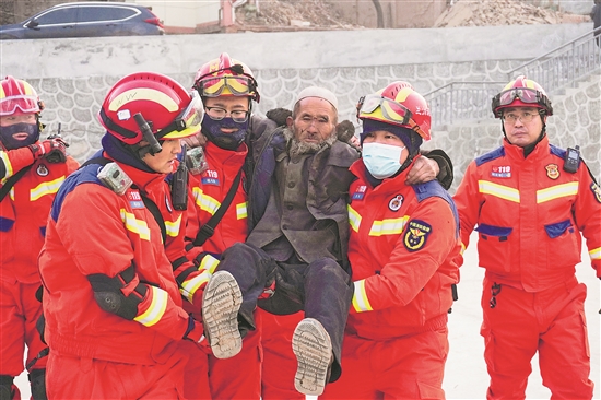 12月19日,在甘肃临夏州积石山县大河家镇大河村,消防人员开展救援。12月18日23时59分,积石山县发生6.2级地震。当前,甘肃省正全力组织救援。