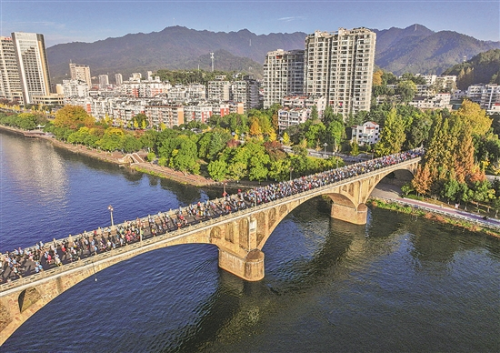 11月19日,参赛选手在浙江建德新安江马拉松赛中经过白沙大桥(无人机照片)。新华社记者徐昱 摄