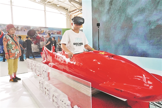 9月15日,观众在2023国际冬季运动(北京)博览会现场通过VR设备体验雪车。 新华社记者 任超 摄
