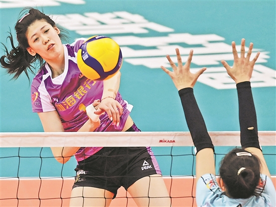 11月7日,天津渤海银行队球员李盈莹(左)在比赛中扣球。当日,在本赛季中国女子排球超级联赛第一阶段小组赛A组比赛中,天津渤海银行队战胜河南双汇队。