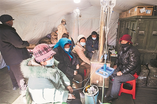 12月22日,甘肃省积石山县柳沟乡肖红坪村安置点,受灾群众在解放军战士搭建的帐篷医务室内就诊。