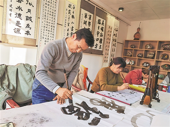 新疆生产建设兵团第三师图木舒克市四十一团草湖镇地处南疆两地(喀什地区、克州)一市(喀什市)三县(疏勒县、疏附县、阿克陶县)中心地带,四十一团是兵团最早成立的团场之一。草湖镇白杨社区在社区内新时代文明实践站建起书画室,为边疆退休职工开辟了一个活动好去处,既丰富了他们的退休生活,又为搭建起一个联系平台,每天都吸引职工前来。图为12月11日,几名退休职工在书画室内练习书法绘画。本报记者 邓崎凡 摄
