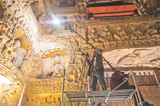12月10日,山西大同,研究人员正在云冈石窟景区的一处洞窟内拍摄数码照片。