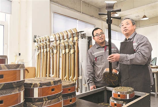 三弦是我国传统弹拨乐器。近年来,素有“中国北方乐器之都”美誉的肃宁县在沿袭传统三弦制作工艺的同时,不断改进和创新,让传统工艺在传承中创新发展。 新华社记者 牟宇 摄