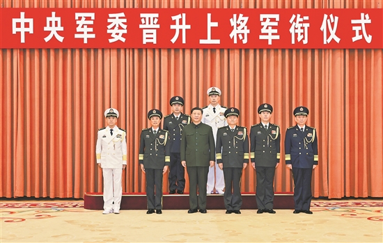晋衔仪式在嘹亮的军歌声中结束。随后,习近平等领导同志同晋升上将军衔的军官合影。