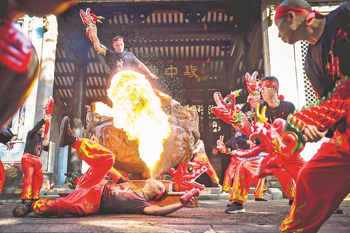 12月24日,广东中山黄氏大宗祠,当地村民在进行国家级非遗醉龙舞表演。