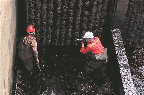 7月22日,在位于河北唐山的冀东油田油气集输公司高尚堡联合站生化池内,班组员工头顶烈日,站在齐膝深、接近40摄氏度的泥水中进行清淤作业。该油田新闻中心记者杨军也下到池内,近距离拍摄清淤作业的场景。王翔 摄