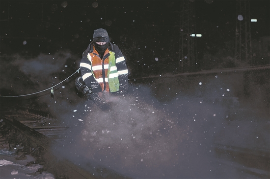 11月2日凌晨,刘杨在齐齐哈尔站南场使用风力除雪机进行除雪作业。次日,他就此写了通讯《鏖战暴风雪》。孙浩 摄