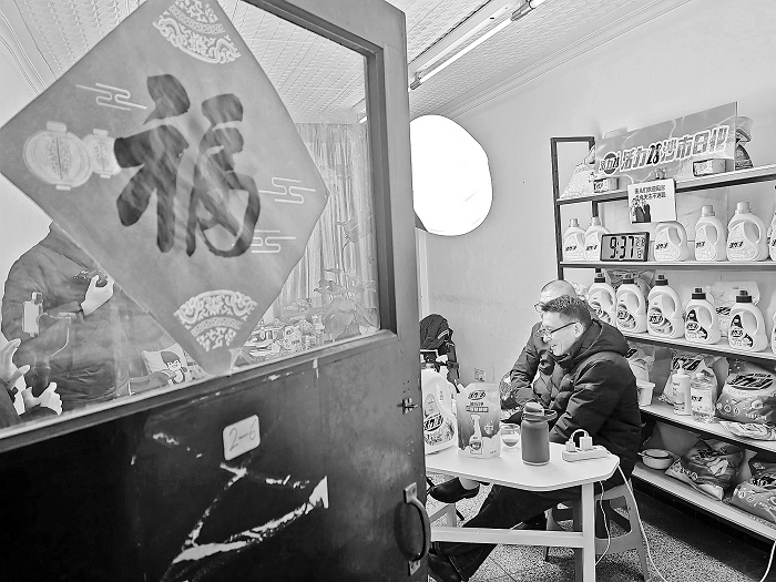 推开一扇老旧的门,“眼镜大叔”万仲和“光头大叔”沈军正在直播。本报记者 李娜 摄