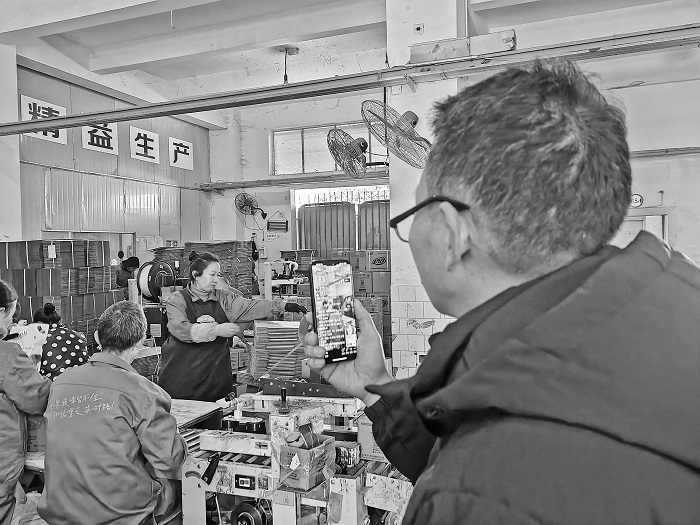 直播时,“活力大叔”不时会将手机对准车间和产线,他们把这称为“巡山”。本报记者 李娜 摄