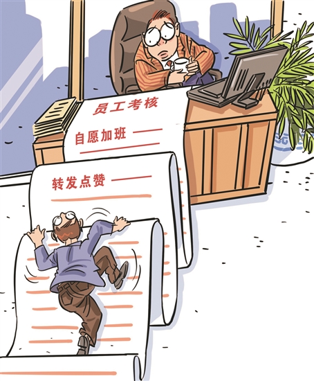据《法治日报》12月26日报道,年终岁末,个别企业的奇葩年终考核内容令员工敢怒不敢言。比如,有的企业考核中有加班次数和加班时长的选项,导致员工不得不“自愿”加班:有的企业考核项目为员工点赞企业微信公众号文章的数量;还有企业在员工下班后设置阅读、运动等任务……