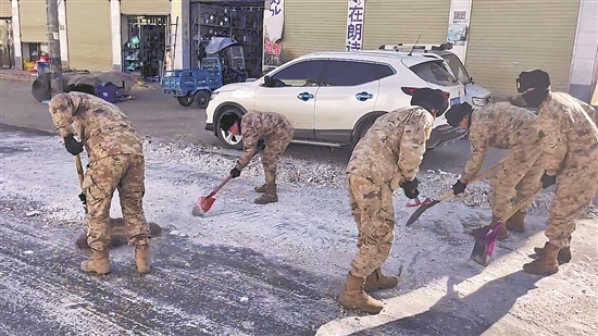 12月22日,在甘肃省积石山县柳沟乡,来自西部战区的解放军战士正在进行除冰作业。这是一条通往受灾地区的重要道路,也是运送救灾物资的“生命线”。因为海拔高、气温低,不少路段结冰,影响了车辆通行,解放军战士通过铁锹、斧头、铁锤等工具进行除冰,确保道路通畅。(本报记者 康劲 王伟伟)
